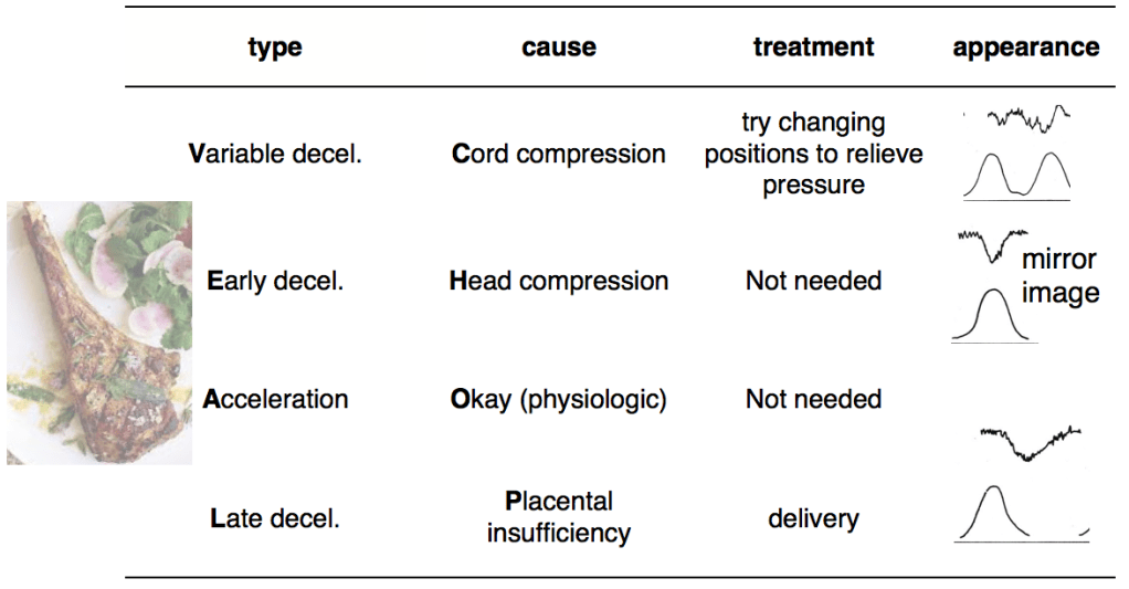 “VEAL CHOP” was a good way to remember fetal heart tracings. This is part of fetal heart monitoring to measure fetal distress. You look at the fetal heart rate (top trace) and uterine pressure (bottom) in these traces.